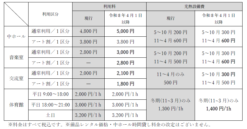 つきましては誠に恐縮ではございますが、施設管理運営委託が更新となる令和8年4月1日より以下の表のとおり価格を改定させていただきたいと存じます。(その場合、体育館を定期利用されている団体・個人の皆さまには、令和8年4月1日~30日までの期間において、別途、令和7年度利用契約に沿ったご利用料金で提供いたします。)